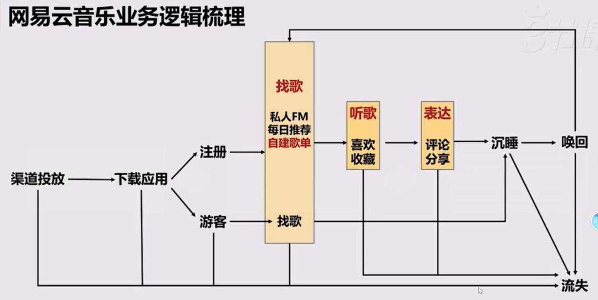 网易云音乐是一款集在线音乐平台和供音乐爱好者进行互动的内容社区,其产品的核心驱动力是找歌和听歌,所以梳理主业务逻辑就围绕着找歌和听歌展开,梳理后逻辑图见图1-1。