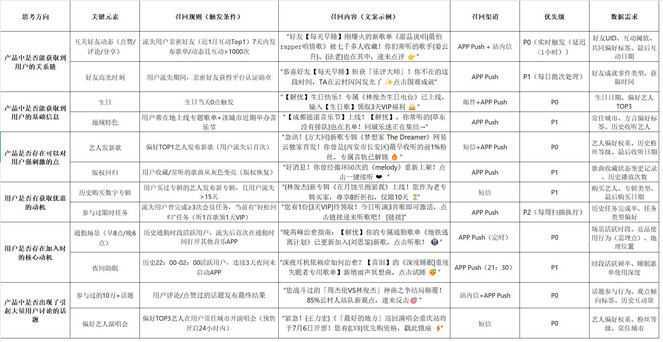评估完可召回的流失用户后,就可制定流失用户的召回策略。可以从下面几个思考方向入手,提取网易云音乐产品内的可进行策略制定的关键元素。