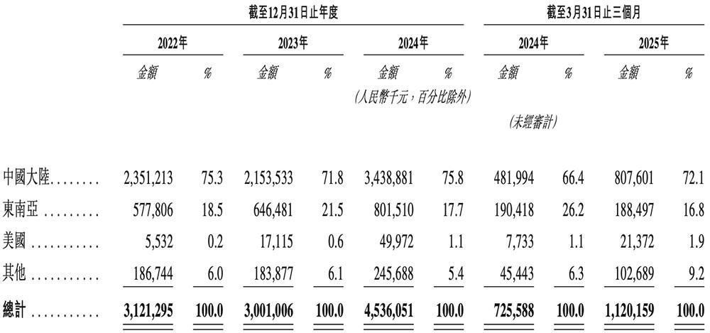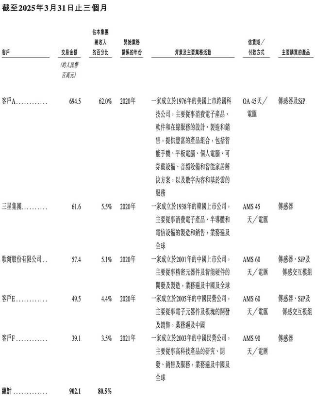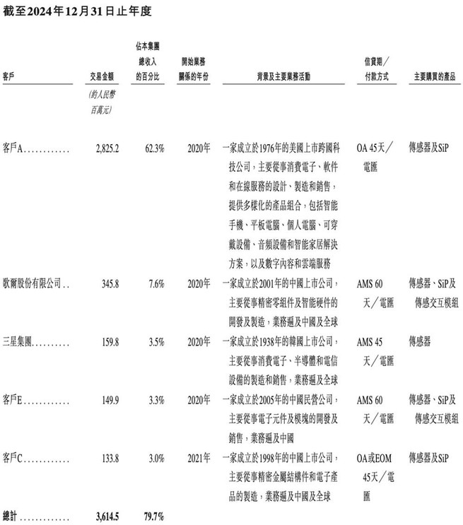 2022年、2023年、2024年、2025年前3个月,来自歌尔微五大客户的收入分别为23.56亿元、22.30亿元、36.15亿元、9.02亿元,分别占同期总收入的75.5%、74.3%、79.7%、80.5%;其中来自客户A的收入分别占同期收入总额的56.1%、49.4%、62.3%、62.0%。