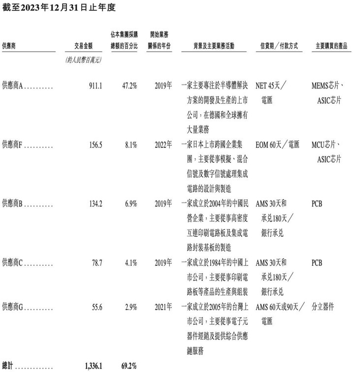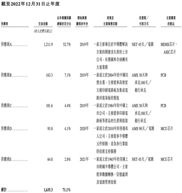 自2009年起,歌尔微已与供应商A (一家在MEMS麦克风芯片方面领先的欧洲公开上市半导体公司)维持长期战略伙伴关系,是其MEMS及ASIC芯片的主要客户之一,占歌尔微直接材料成本的最大部分。为确保供应持续性,歌尔微已与供应商A订立战略协议(包括保留产能安排)。