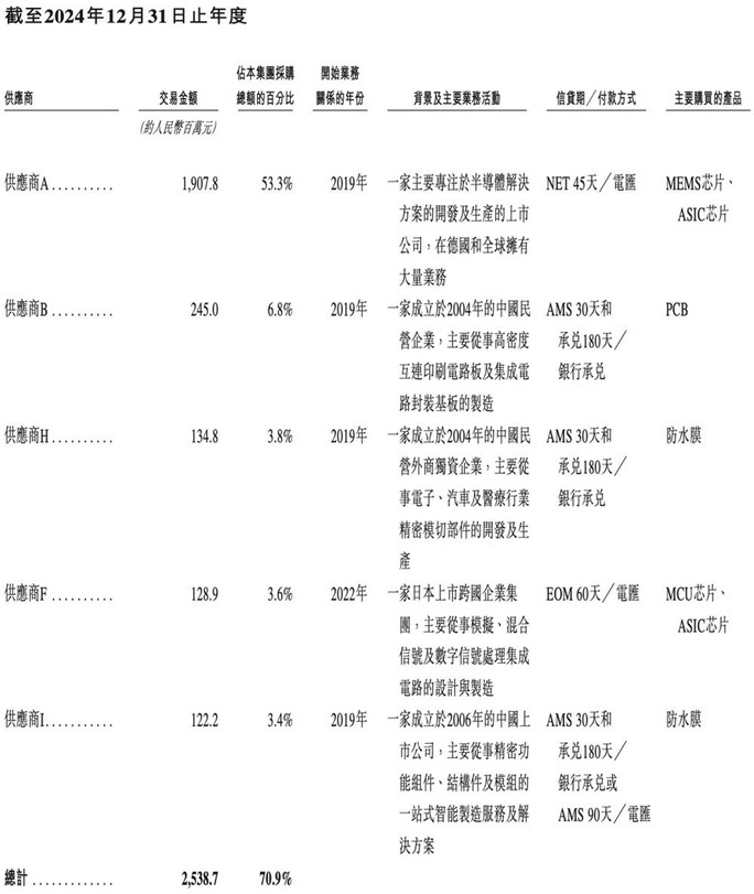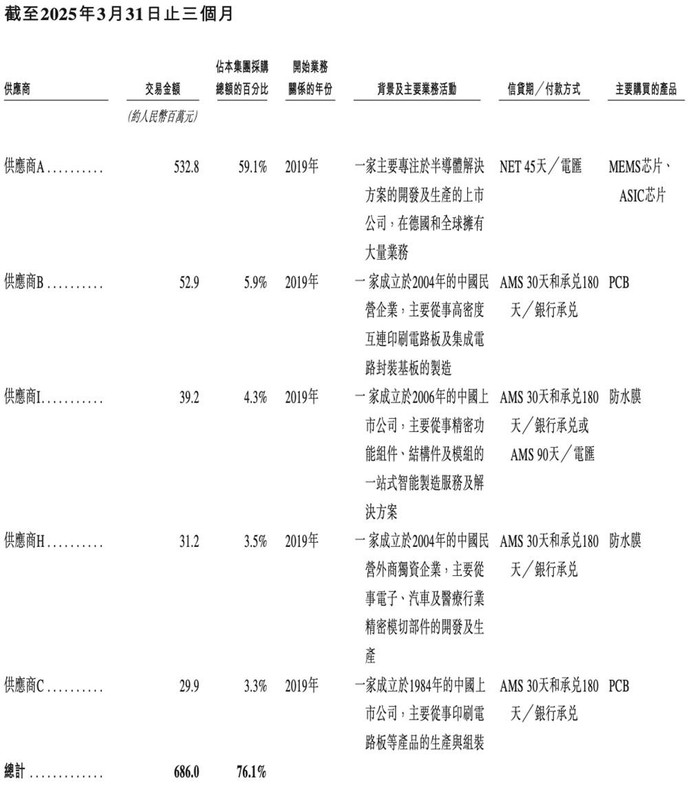 供应商F是歌尔微在2023年、2024年及2025年前3个月的5大供应商之一,亦是歌尔微在2022年、2023年、2024年的客户。