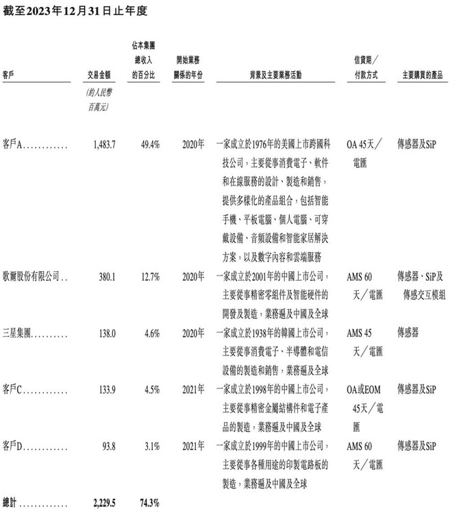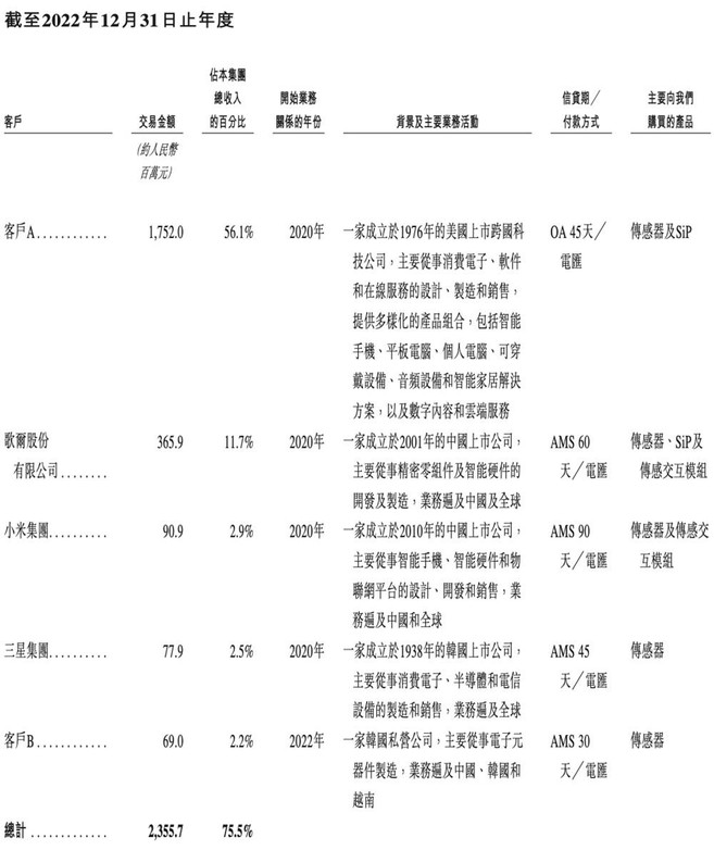 歌尔微自2010年起便与一家领先的美国跨国科技公司客户A维持长期战略关系,主要向客户A供应声学传感器、压力传感器及SiP。
