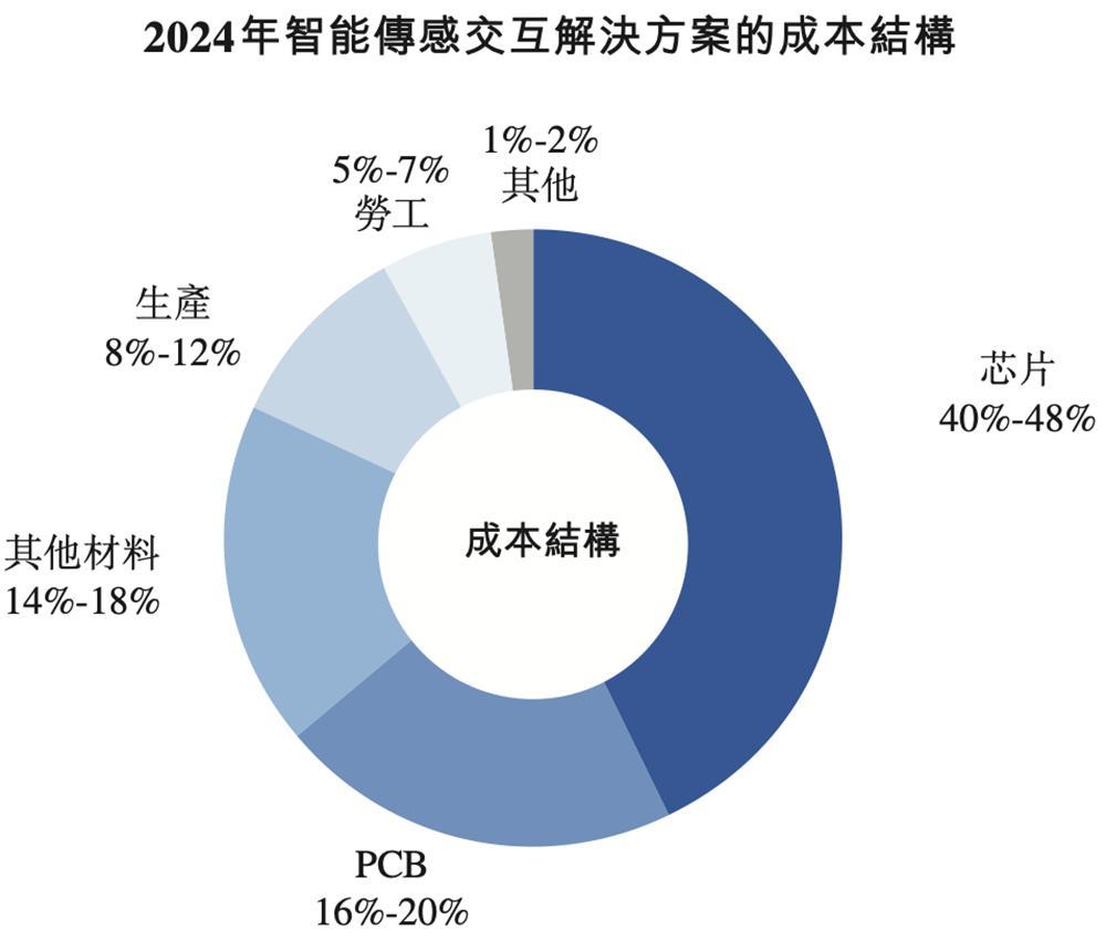 智能传感交互解决方案的主要成本是材料,包括芯片、PCB及其他材料。芯片约占总成本的40%至48%。