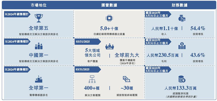 于往绩记录期间,其传感器累计出货量超过50亿颗,累计服务全球126家直销客户,覆盖全球前九大手机厂商(以2024年出货量计)和各种应用场景的领先厂商。