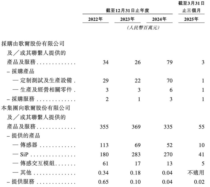 歌尔微一直向歌尔股份购买相关产品及服务,以满足业务及营运需要,与歌尔股份及/或其联系人已建立长期稳定的业务关系。同时,歌尔微向歌尔股份及/或其联系人供应相关传感器、SiP及传感交互模组以及配套加工及测试服务。其历史交易金额如下: