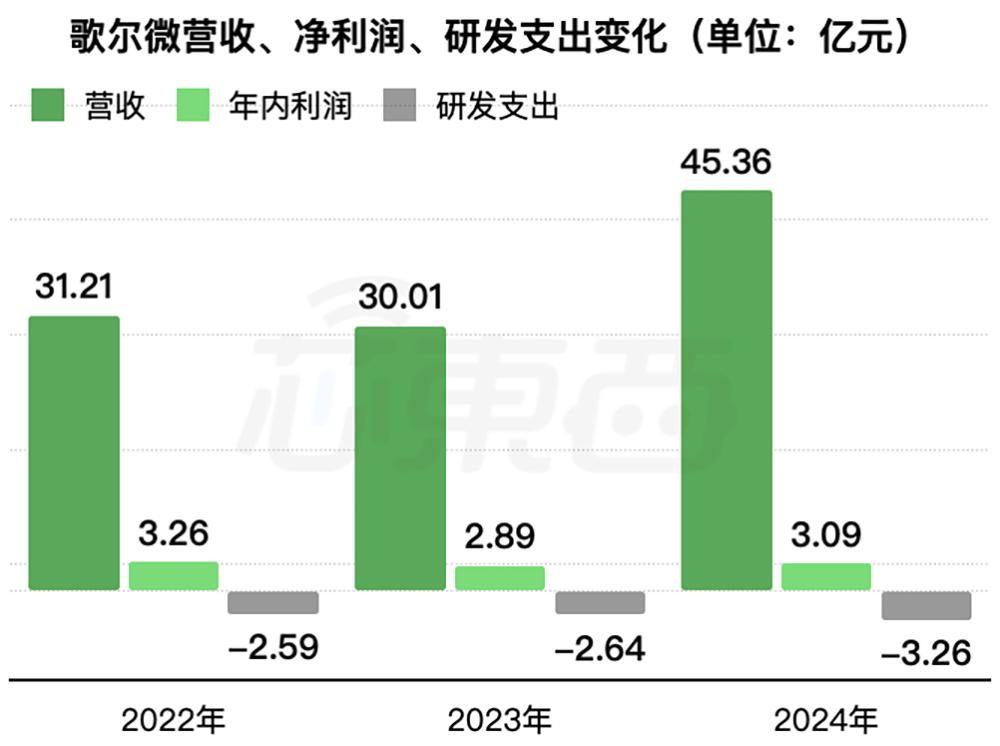 2022年、2023年、2024年,歌尔微的营收分别为31.21亿元、30.01亿元、45.36亿元,年内利润分别为3.26亿元、2.89亿元、3.09亿元,研发费用分别为2.59亿元、2.64亿元、3.26亿元。