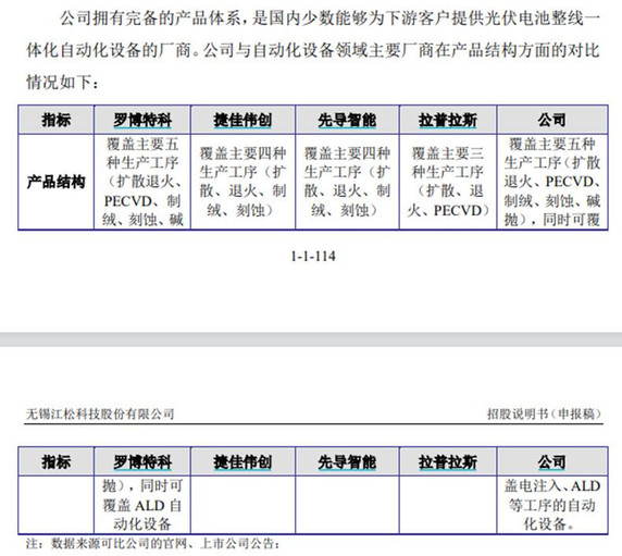 在招股说明书中,江松科技披露:在产品结构方面,自己可以覆盖主要五种生产工序(扩散退火、PECVD、制绒、刻蚀、碱抛),同时可覆盖电注入、ALD等工序的自动化设备。捷佳伟创和先导智能只能做四种生产工序,看来只有罗博特科可以和江松科技媲美,能做五种生产工序。