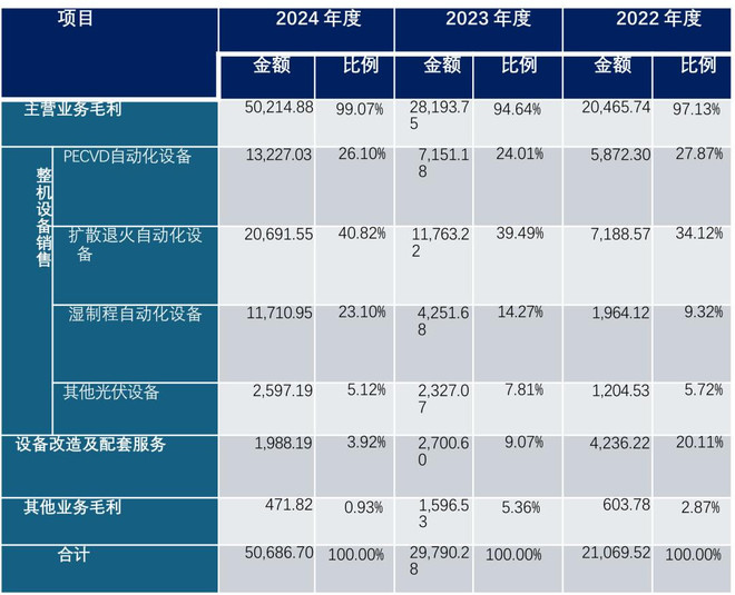 从招股说明书披露的主营业务收入及毛利来看,江松科技主打光伏电池设备,包括电池扩散退火、PECVD、湿法制程自动化设备(制绒、刻蚀、碱抛)。