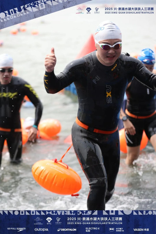 杨文炤第一次在迪卡侬看到铁人三项比赛的宣传海报时,才刚学会游泳半年,怀着一腔热血报名了2025兴·泉滴水湖大铁铁人三项赛(半程标铁)后才更深刻地感知到难度,“第一次上公开水域游泳课,水温特别低,刚下去200米就抽筋了”。正式比赛前试水时,他又因伸手拉其他选手上岸而不慎拉伤了右臂,最后坚持完赛,“大概比大部队慢了1个小时”。