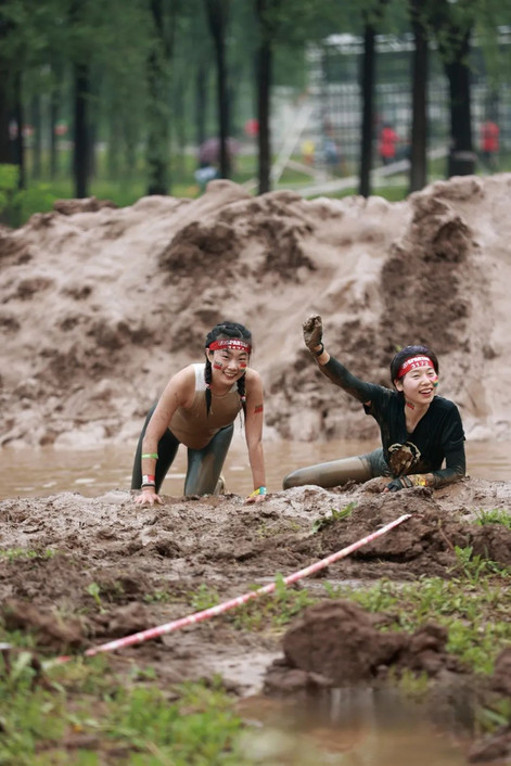 他们会提前扎好脏辫,穿上不便宜但低调的速干运动服,到比赛场地后在脸上涂上彩绘;摄影师早早在每一个赛场的障碍处翘首以待,大光圈、人像模式,捕捉参赛者扛起20公斤沙袋、跳进泥坑获得专属泥咖色皮肤、跳过火线的英雄瞬间——这样,一条能展现身形、肌肉、力量又不做作的“野人感”朋友圈就有了。