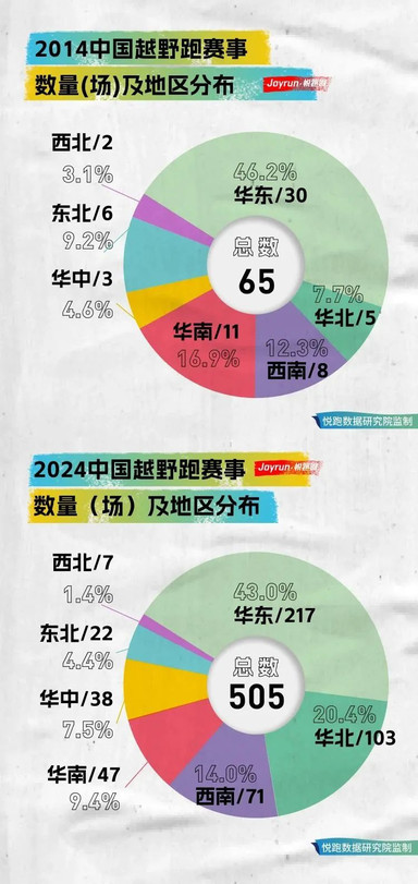 以越野跑为例,据《2024中国越野跑大数据》统计,2024年国内越野跑赛事共举办505场,而在10年前,这一数据是65场,如今增长到近8倍,还出现了与马拉松相似的“一签难求”现象。今年崇礼168超级越野赛的平均中签率为64%,其中作为大众爱好者入门的30公里组别,中签率仅为46%;而环四姑娘山超级越野跑35公里短距离组的名额在开始报名后5分钟内售罄。
