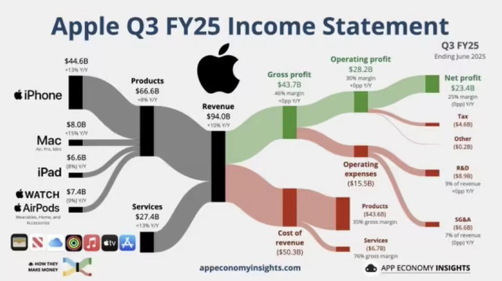 美股7月31日盘后,苹果对外发布了2025年第二季度财报,从数据上来看,收入利润双丰收。其中,总净营收为940.36亿美元,同比增长10%;净利润为234.34亿美元,同比增长9%。值得一提的是,10%的收入增速,也是苹果自2021年12月以来最大的季度收入增幅。