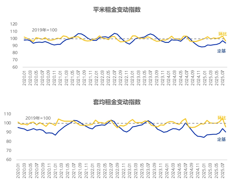 据我爱我家监测统计,2025年8月,我爱我家北京住房租赁市场整租交易中,每平米平均租金与每套平均租金环比均有所下跌,环比跌幅略见明显;租金同比持续下跌。