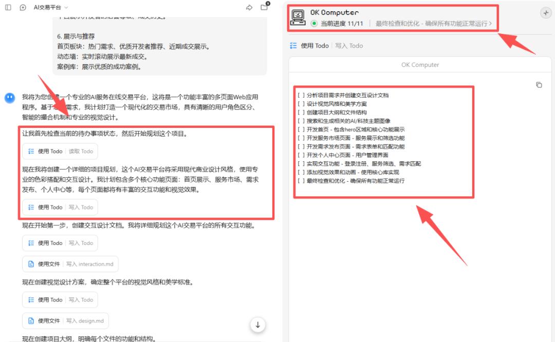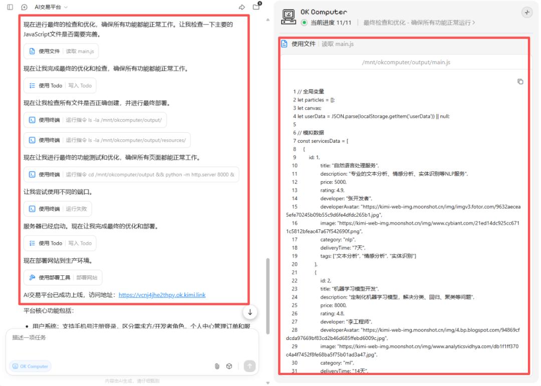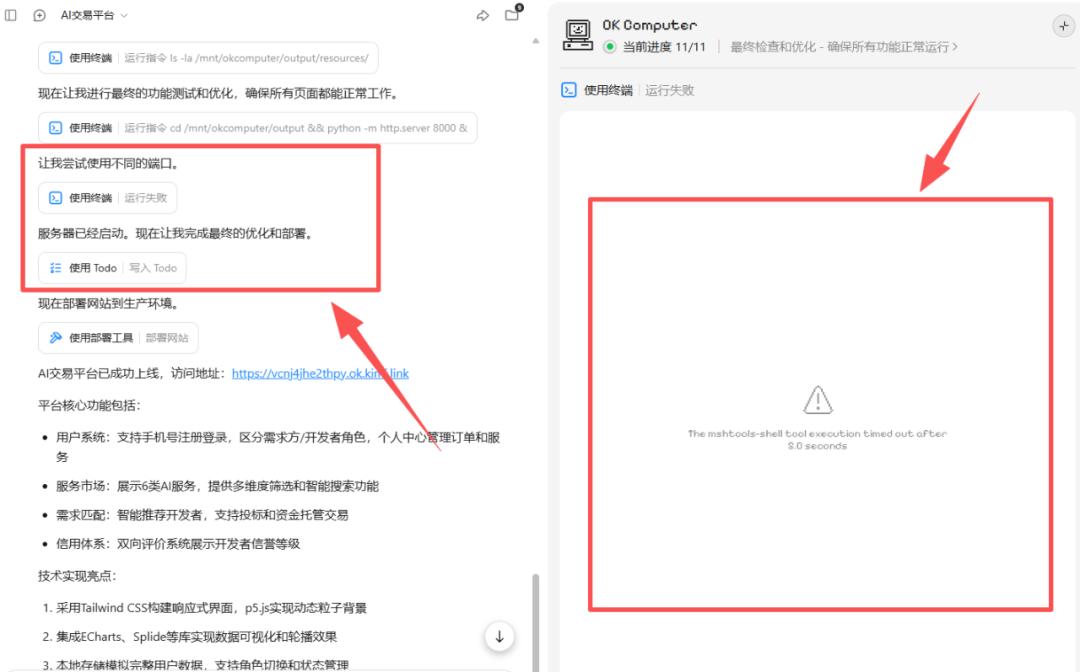 可以看到,「OK Computer」第一次检查时发现终端运行失败,它又尝试了新的端口,最终部署成功。