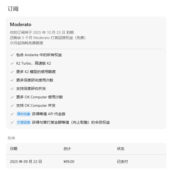 说真的,没想到Kimi还能记得我们第一波的打赏用户,这真的太走心了吧!所以我毫不犹豫就冲了他们家的最高档Moderato会员(可以使用20次「OK computer」),还赠送了5个月的会员。