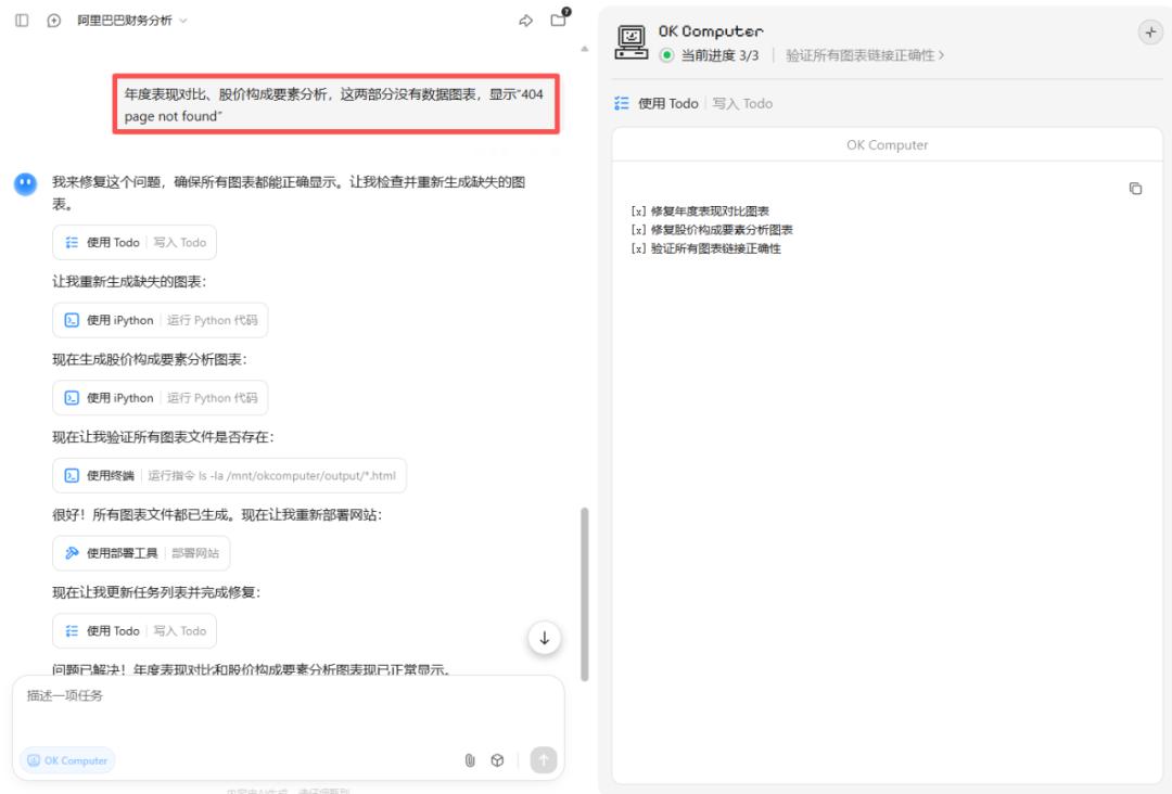 刚开始,Kimi给我交付的结果,有2张图表无法显示。我们直接口喷需求让他改,很快就修复了问题。