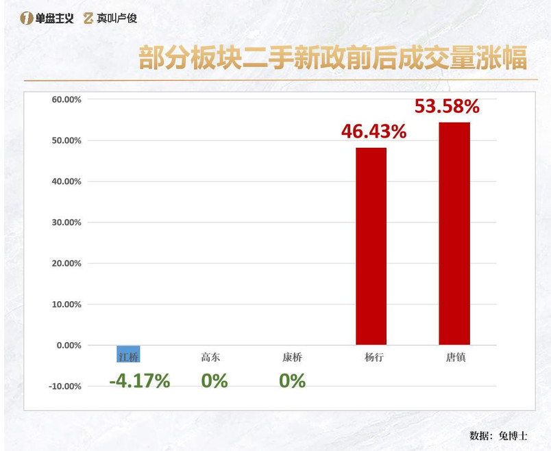 对比可以看唐镇这样,挨着上海价值最大的张江产业园的板块,在新政后成交量提升比较明显,53.58%的增长量。杨行也一样的道理,周边有宝山工业园区、机器人产业园等,新政之后成交量上升46.43%。