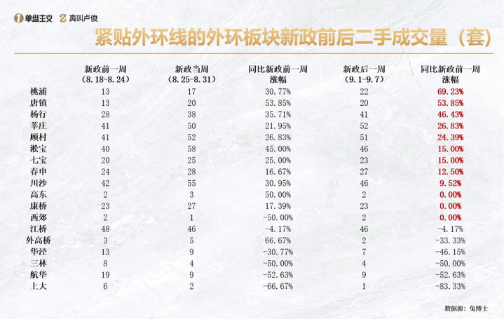 新政后的一周成交量相比于新政前,部分板块,比如桃浦和唐镇,其成交量能上升超过50%。