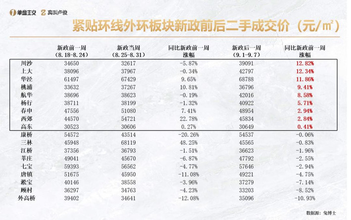 事实上,虽然有一部分板块降低单价,趁此机会尽快去存量。但总的来说,一半左右的板块成交价其实还在上涨。比如川沙板块的成交均价比新政前一周还上涨了12.82%,传统强势板块华泾也在新政一周之后成交均价上涨11.86%。