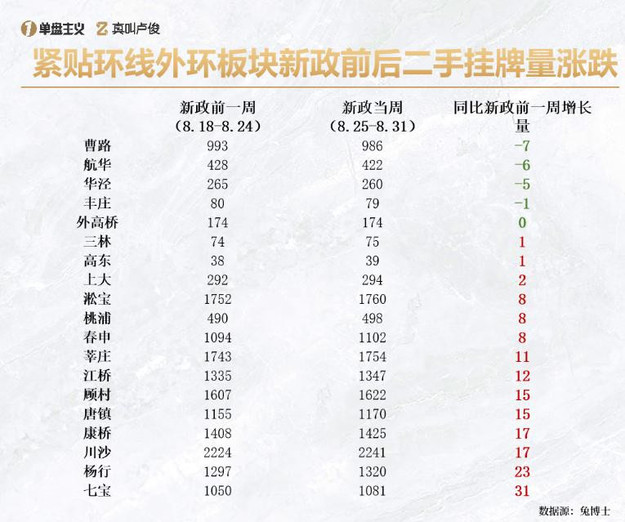拉了一下新政前一个星期、后一个星期以及半个月的二手市场成交数据,发现紧贴外环线的外环板块还真是吃上红利了,大部分纯外环板块成交量有了明显的提升。