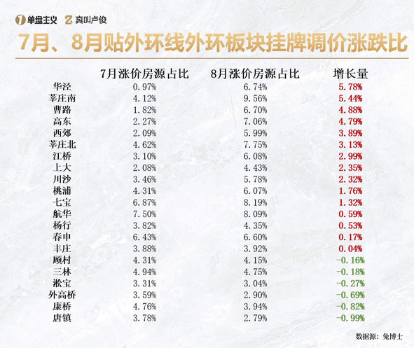 但看到另一个数字:上调价格房源比例,我的想法有所变化。也许紧贴外环线上的板块房东心态相比其他区域还稍微乐观一些,8月的涨价挂牌房源占比几乎大多超越7月。