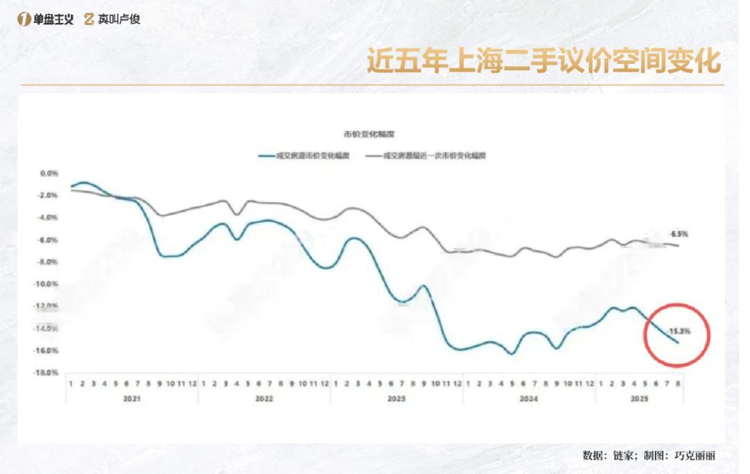根据上海近五年二手议价空间的变化来看,当下降价幅度已经来到了最低:-15.3% ,也就是说,500万的房子可以降价76.5万拿下。