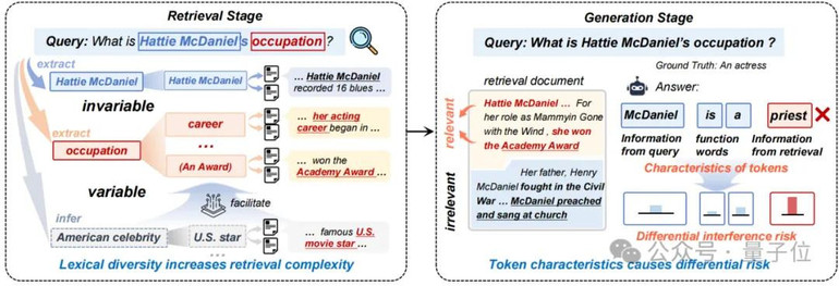 研究团队指出,现有RAG方法大多通过“单一标准”判断检索文档是否相关,但现实情况要复杂得多。如图所示,以问题“What is Hattie McDaniel’s occupation?”为例,其中的语义成分表现出不同程度“词汇多样性”: