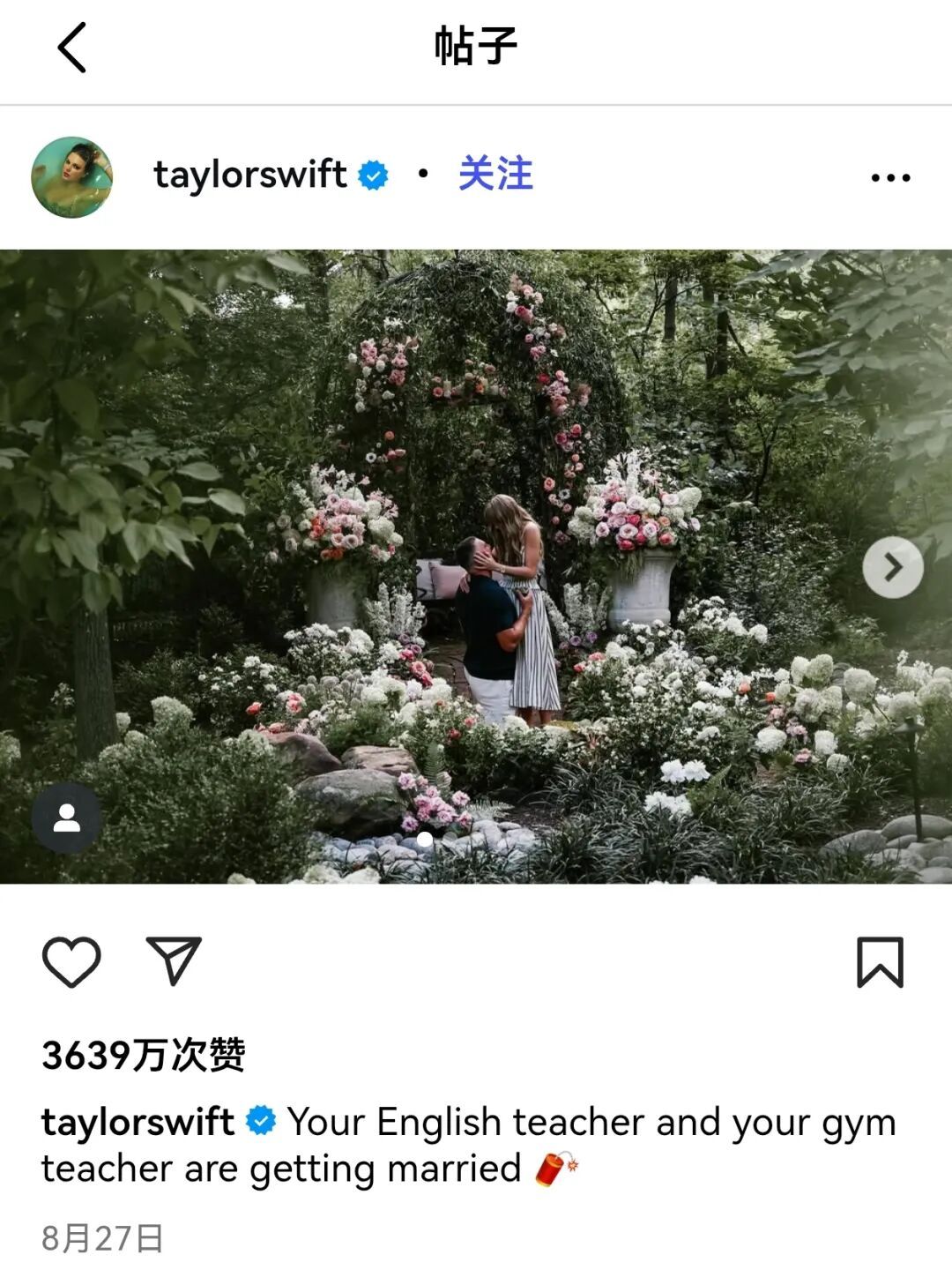 霉霉晒出了二人的花园求婚照,并俏皮配文“你的英语老师和你的体育老师要结婚了”。