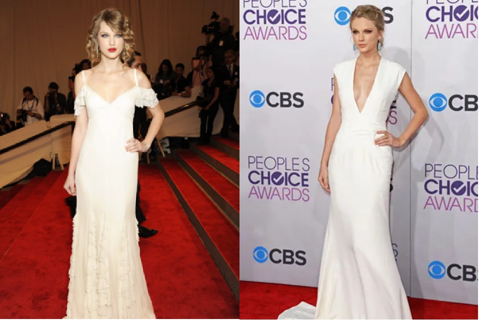2010年5月,霉霉出席Met Gala(左);2013年1月,霉霉在美国人民选择奖颁奖典礼(右)