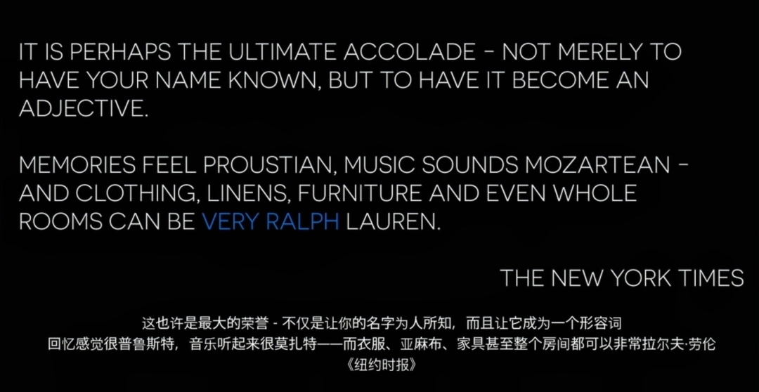 在时尚界,“Very Ralph”也已经成为一种生活方式的代名词,它代表着体面、经典、努力实现美好生活。《纽约时报》曾发表评论说:“这也许是最大的荣誉——不仅是让你的名字为人所知,而且让它成为一个形容词。”就像一段回忆可以让人感觉很普鲁斯特,一段音乐可以听起来很莫扎特,而对于衣服、亚麻布、家具甚至是整个房间,人们都可以说它“Very Ralph”。