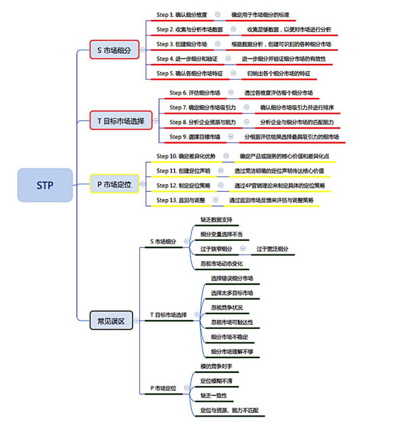 当企业在实施STP理论时,可能会陷入一些常见的误区或犯一些错误。以下是针对市场细分、目标市场选择、市场定位三个阶段中的一些常见误区: