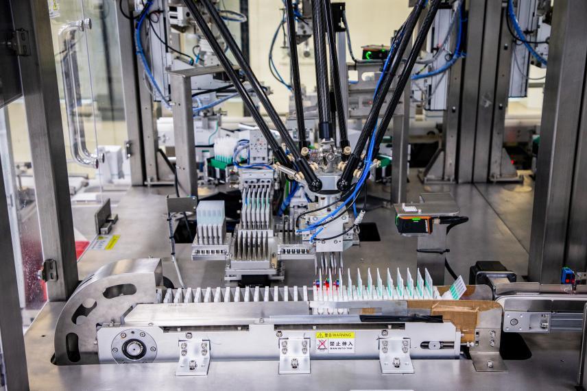 在符合“黑灯工厂”标准的皮肤科学创新转化产品示范车间里,造价高达2500万元的三合一无菌灌装机、包装机器臂等自动化设备,忙忙碌碌。据介绍,该车间满负荷运转、一天可生产价值上千万元的次抛精华,仅需两位工人值守。