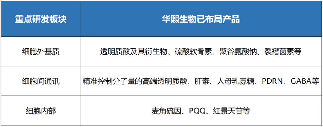 基于糖类物质在细胞分化与信号机制中的关键作用,特别是透明质酸作为细胞构建外基质结构的关键指挥中心,以及透明质酸独特的通过不同分子量组合模式来精密调控细胞行为的全新科研前沿认知,华熙生物的研究范围从透明质酸所在的细胞外基质(ECM),延伸至细胞间通讯和细胞本身形成了细胞外基质、细胞间通讯和细胞内三大核心板块。