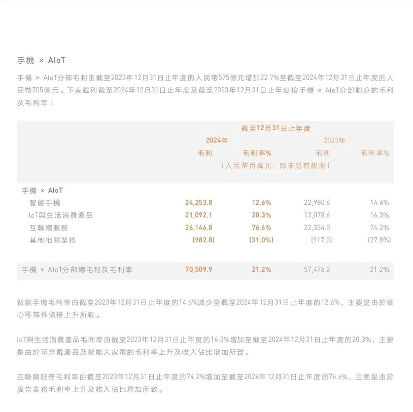 从24年财报来看,小米“互联网服务”毛利最高,约26亿,超越智能手机、IoT和其他相关业务,毛利率更是高达76.6%,相比之下,智能手机的毛利率只有12.6%。“服务比硬件更赚钱”,确实不是说说而已。