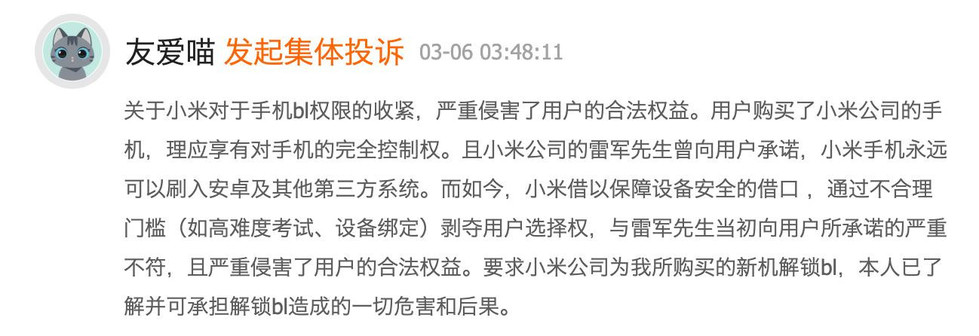 在黑猫平台,有用户发起集体投诉,表示“雷军曾承诺可刷第三方系统,如今却食言”,剥夺了用户对手机的控制权,严重侵害用户的合法权益。