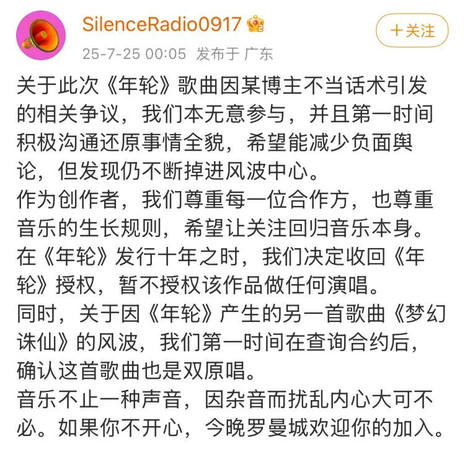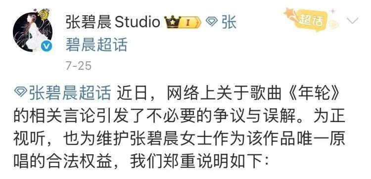 汪苏泷团队于7月25日发布微博,声明《年轮》为“双原唱”,并宣布收回《年轮》授权。张碧晨工作室随后发文称,经所有可查证的公开音乐发行记录明确显示,张碧晨演唱的《年轮》是首个公开发行并广泛传播的录音版本,并且在2015年受邀演唱歌曲时,也从未被告知该歌曲在同时期有其他艺人再版,也并未在合同签署中有过关于约定多版演唱者的任何描述。因此,张碧晨是《年轮》的“唯一原唱”。
