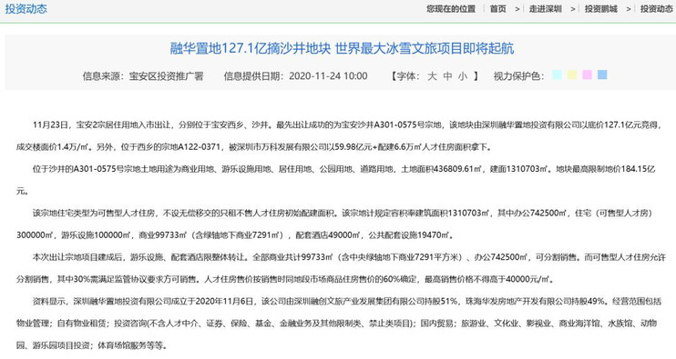 前海冰雪世界项目每次变动都能引发高度关注,一是因为先后操盘该项目的都是地产知名企业。二是因为该项目在出让时就定位为深圳文旅产业的一张名片,要建成世界上最大的室内冰雪场、最大的冰雪文旅城。土地成功出让之后,2021年,深圳宝安区将其列入“重大项目计划”。