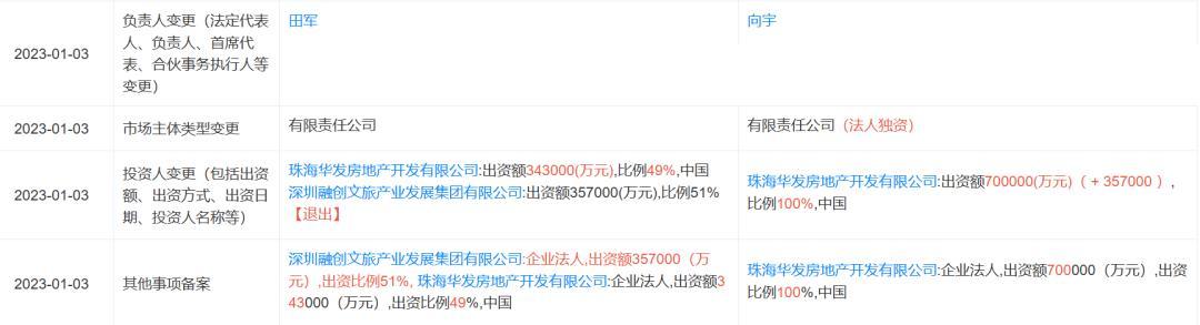 2023年1月3日,前海冰雪世界项目股权完成变更,华发100%控股,同时融创华南区域集团深莞公司总经理田军卸任公司法人代表,由时任华发股份执行副总裁、珠海大区副董事长的向宇接替。