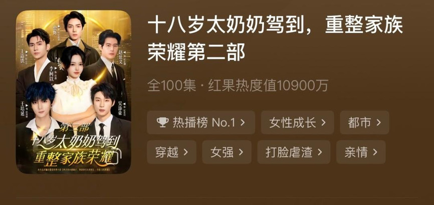以原班人马出演的短剧《十八岁太奶奶驾到重整家族荣耀》第二部于上周五正式上线,延续前作的热度,该剧成为红果第一部上线首日热度值破亿的短剧。饰演女主角「太奶奶」容遇的演员李柯以,成为短剧演员「飞升」的又一成功案例。