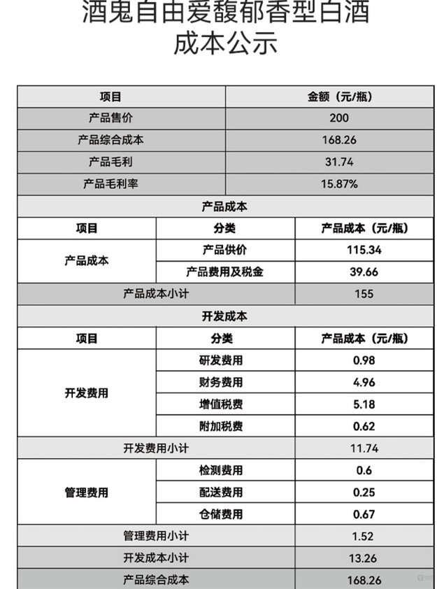 值得关注的是,这款产品同样延续了胖东来“透明定价”的商业模式。在产品详情一栏,胖东来公布产品的成本构成:综合成本168.26元,其中产品成本155元(含供价115.34元及税费39.66元),开发成本13.26元/瓶(含研发、财务、税费等)。最终产品毛利31.74元,毛利率为15.87%。