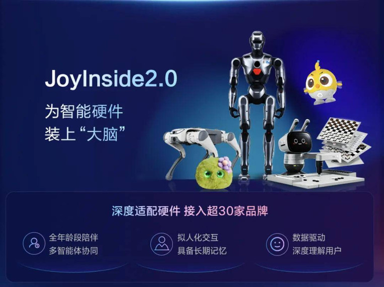 数据显示,接入 Joyinside 的智能硬件,用户会更加主动发起对话,对话次数平均提升超 120%。目前,JoyInside 2.0 已陆续接入超过 30 家头部品牌的硬件产品,并和众擎、宇树等超 10 家领先的机器人品牌合作,并上线京东售卖。