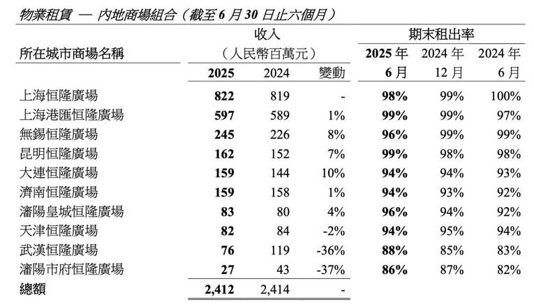 分业务来看,报告期内,恒隆售出香港皓日19个住宅单位、武汉恒隆府1个单位,合计进账1.61亿港元,录得5700万港元亏损。2024年同期,恒隆实现物业销售收入12.28亿港元。