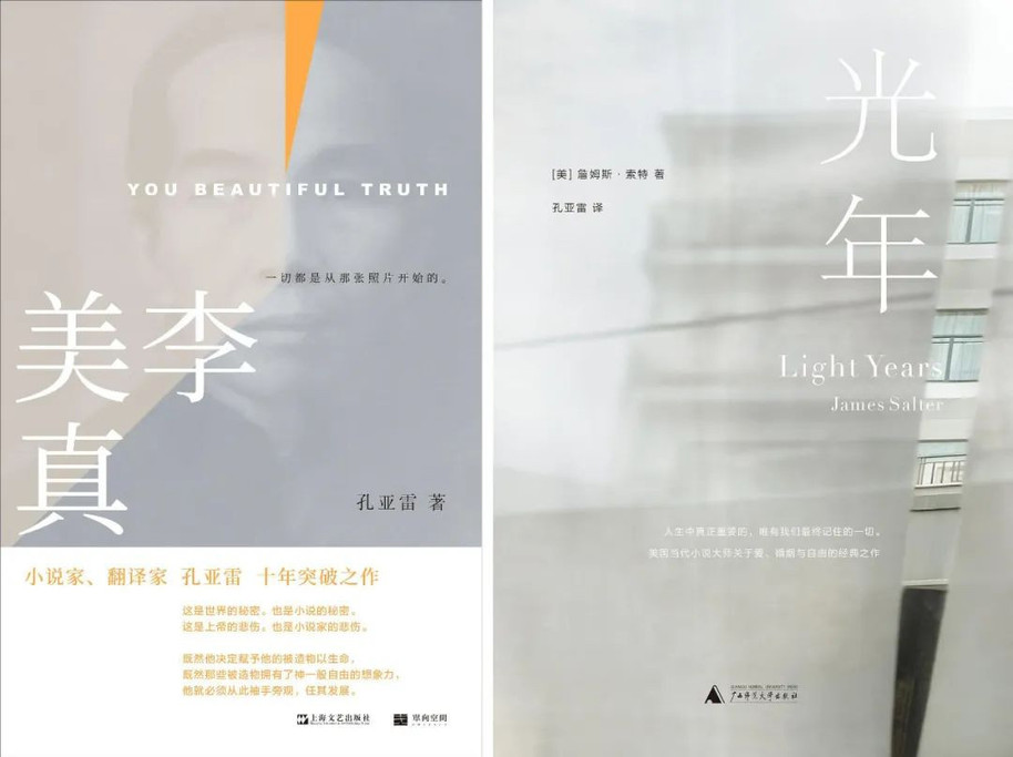 左:孔亚雷长篇小说《李美真》 ,右:孔亚雷翻译的《光年》 ,作者为 詹姆斯·索特