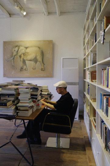客厅更是一片浩瀚的书海,随着新书不断增加,书的海平面还在持续上升,几乎淹没了孔亚雷的办公桌,只留下一小片台面供他写作、翻译,犹如汪洋里的一叶扁舟。