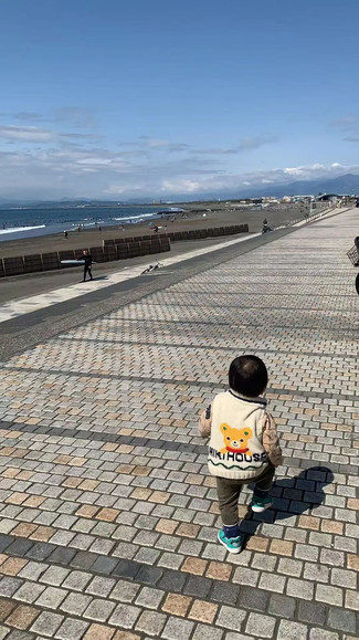 在日本湘南的海岸边遛娃。(图/受访者供图)