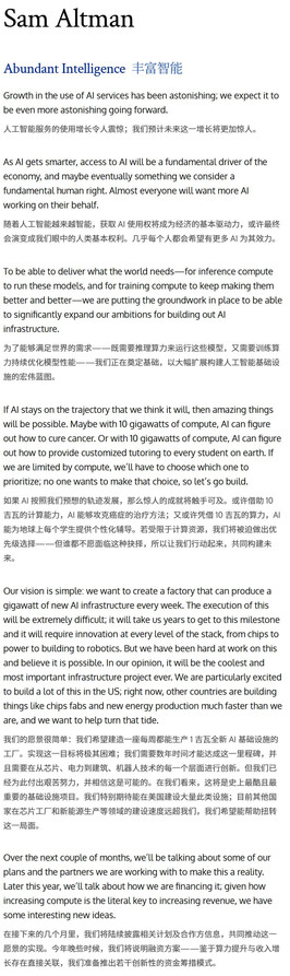 同在今天,奥特曼更新一篇博文——智能富足的时代,进一步阐明了大规模超算建设,将会释放AI的全部潜力。