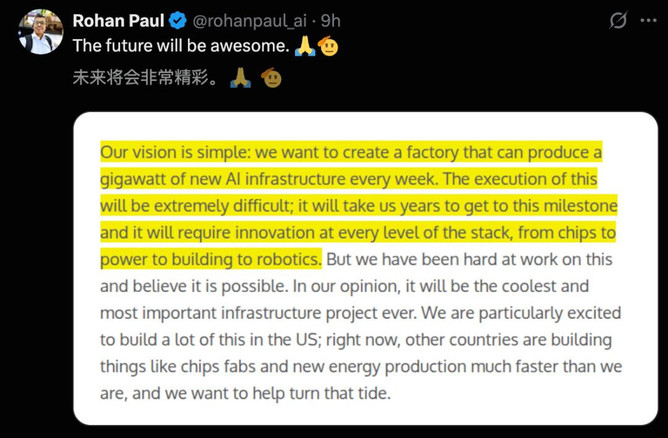 我们的愿景很简单:打造一座「工厂」,每周能产出吉瓦级的全新AI基础设施。