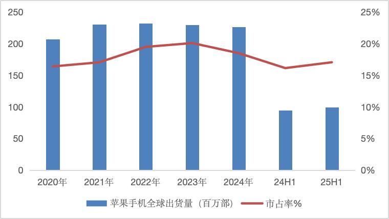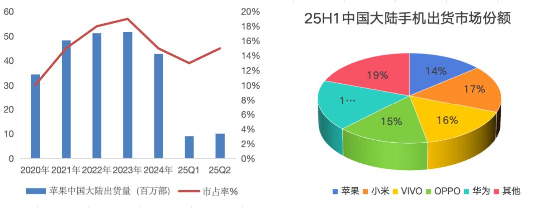 在近几年苹果盈利能力持续提升的同时,其在全球智能手机市场中的销量份额却开始不断“失守”。2024年,苹果手机全球出货市占率从20%降至18%,其中,在中国的市占率更是跌出前三,降至了15%;25年上半年进一步沦为第五名,市占率降到了14%。