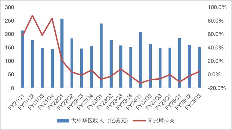 如果拉长周期,可以发现,实际上23年下半年开始,受出货量持续下跌的影响,苹果的大中华区收入就开始呈现负增长。截至25财年第二财季,苹果已经连续7个季度维持负增长,大中华区也成了苹果唯一持续出血的市场。