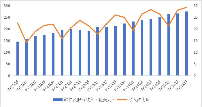 从近5年苹果财报披露的业务构成来看,一个不容忽视的现象是,以ITunes等软件为代表的服务业务收入占比逐年提升。2020—2024财年,服务相关收入的营收从538亿美元增长至962亿美元,同期营收占比从19.6%提升至24.6%,25财年第三财季进一步提升至25.6%。